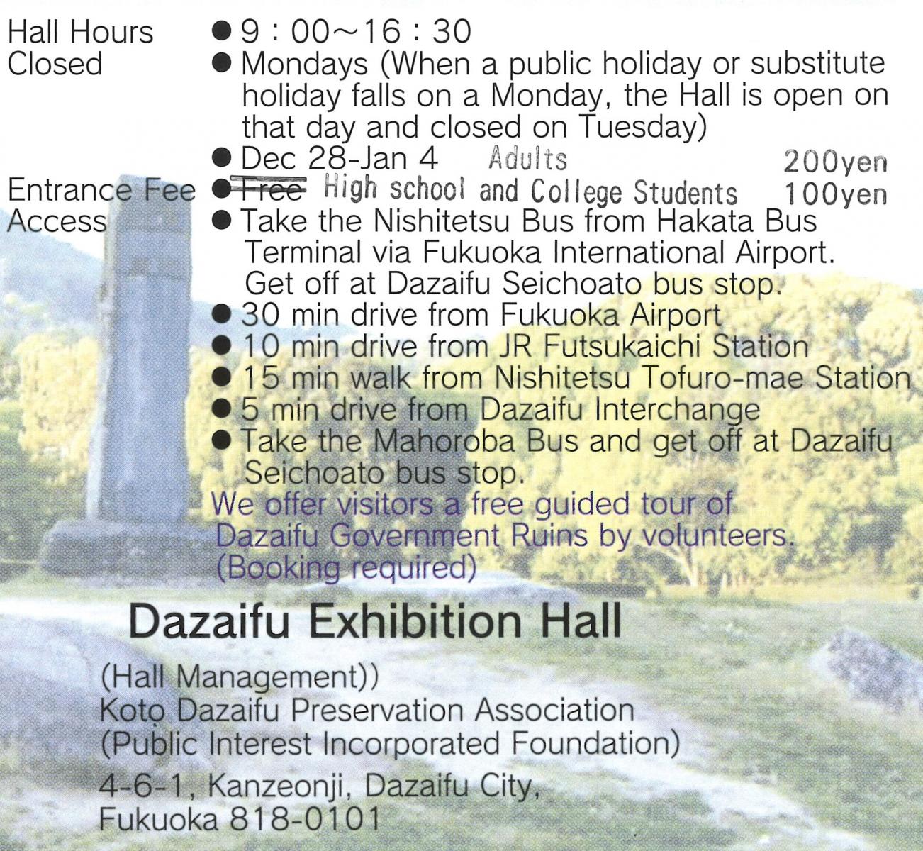 전시관은 다자이후 정청 터 입구 주변에 있습니다. 압도적인 넓이를 자랑하는 고대 다자이후를 찾아가기 앞서 지역의 역사와 고대 다자이후의 모습을 알 수 있는 좋은 기회가 될 것입니다.